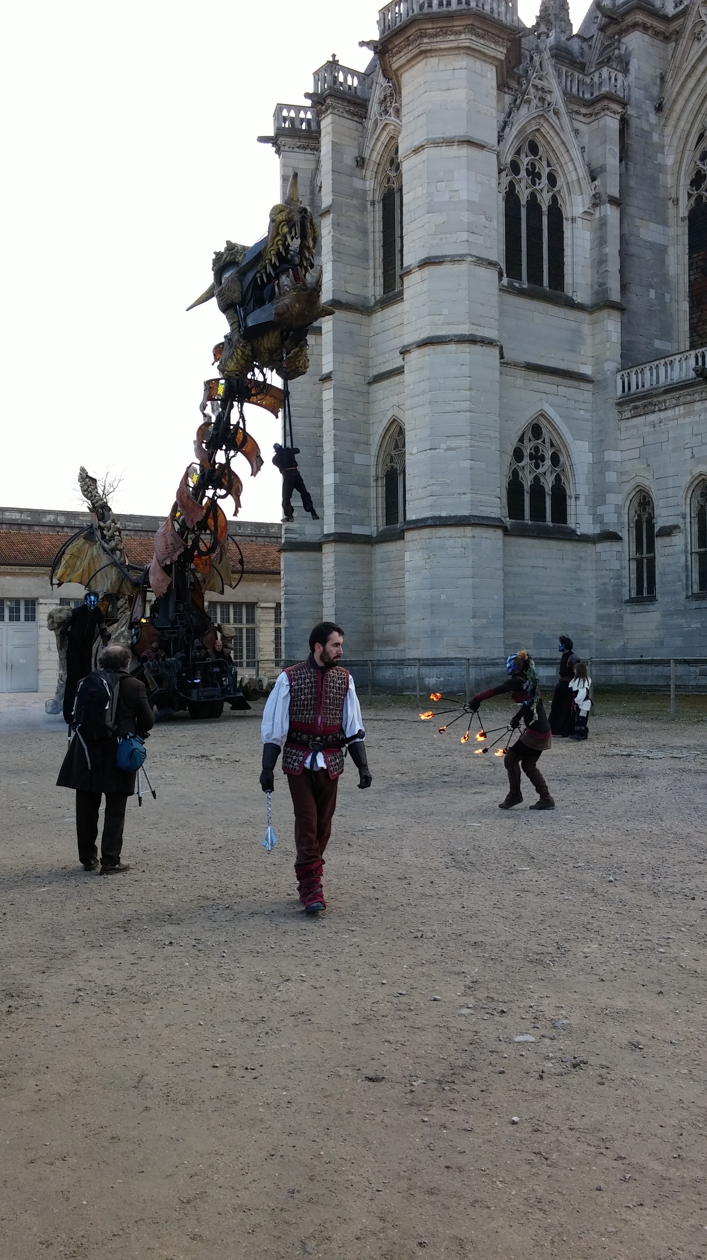 Tout commence dans la cour du château de Vincennes avec un bonimenteur, des cavaliers, et tout à coup la parade commence vers l’église et surgit un dragon !