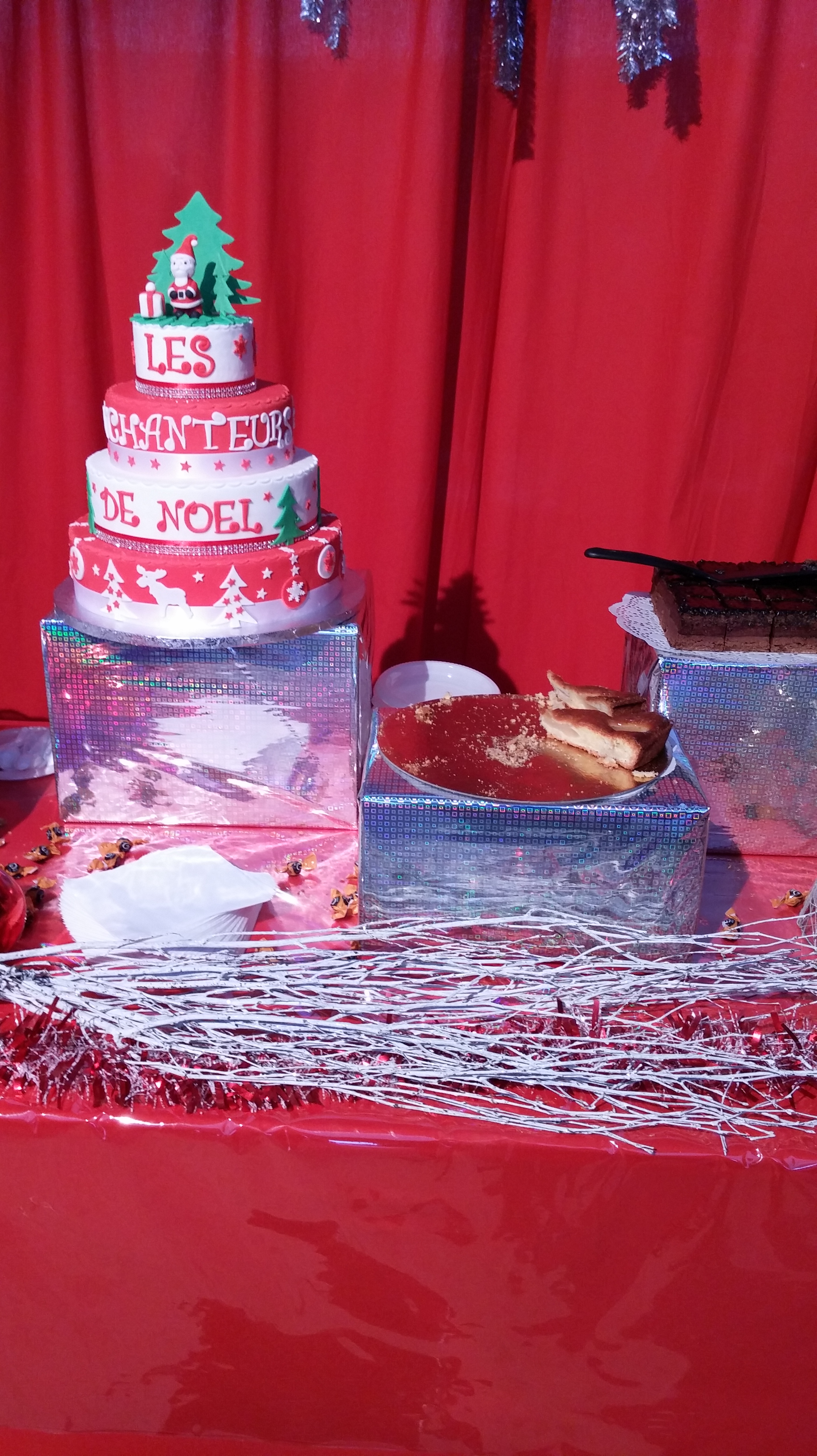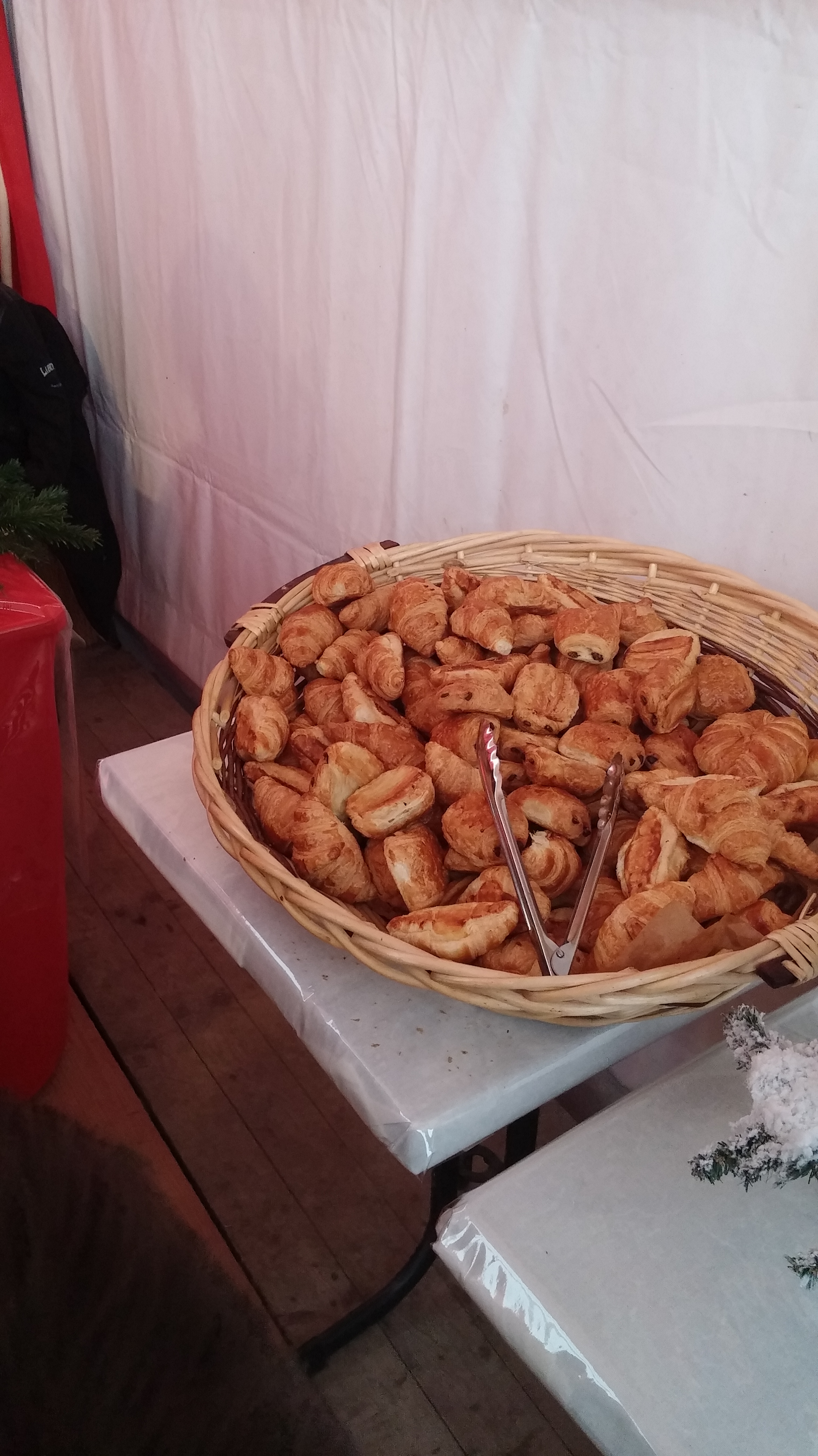 Après le spectacle direction les tentes du goûter. La notre n’était pas chauffée, et cela ressent vite. Le goûter est complet, café et chocolat chaud, viennoiserie, gâteau au chocolat, tarte aux pommes, bonbons, macarons… Rien à redire, les enfants profitent aussi de la venue du père noël avec une séance de photo.