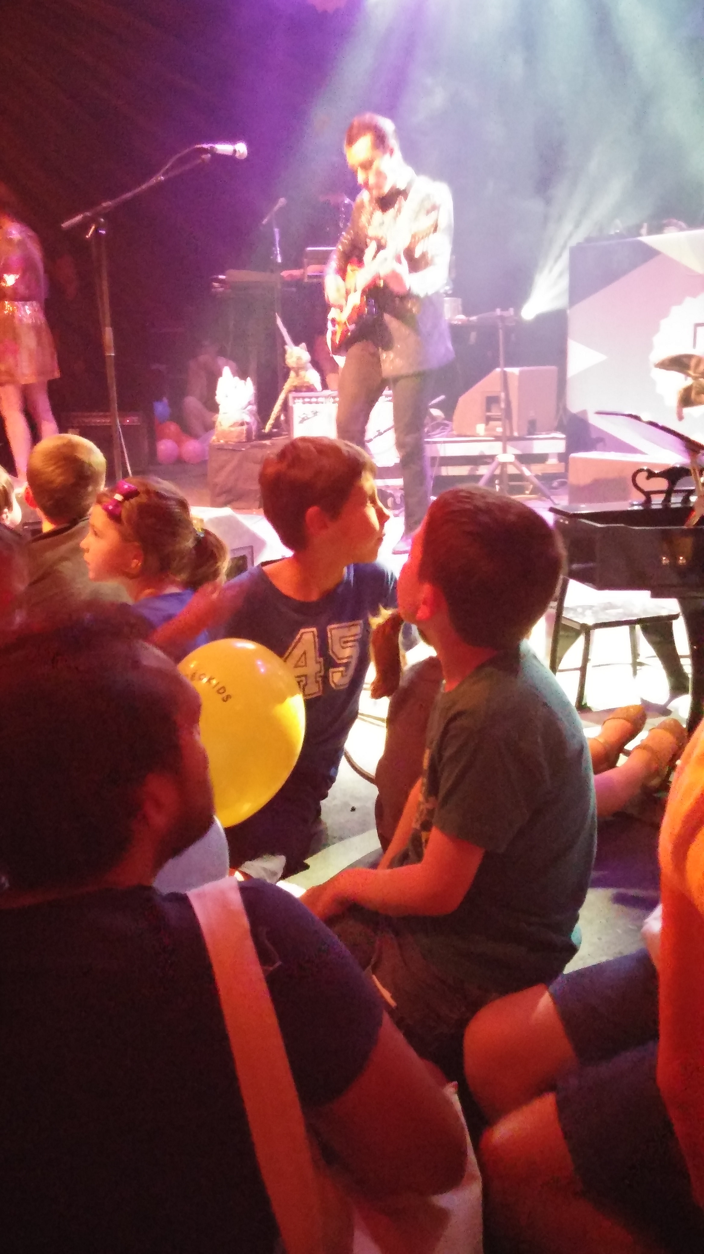 Et surprise, la scène est à hauteur des enfants, l’organisation les laisse s’asseoir aux bords. PetitB fait pareil. Et Moodoïd assure le show en s’adressant aux enfants, en adaptant leur discours, et leur univers coloré, pailleté fait le reste. Une vraie réussite pour une entrée en matière. Ils avaient prévus des ballons, des confettis. Les enfants étaient ravis. PetitB a adoré, il regardait les membres de Moodoïd avec une grande concentration.