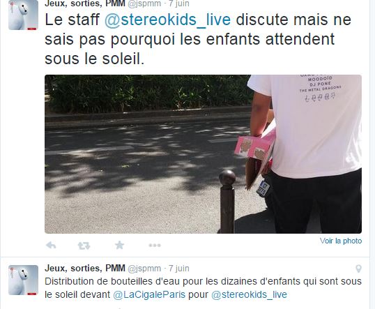 Mise à jour du 09/06/2015 : Stéréokids (@) n’est pas fairplay et n’a pas, visiblement, apprécié mes tweets rédigés lors de l’attente à l’extérieure de la salle. Mon compte twitter @jspmm ne peut plus accéder au leur. Vraiment étonnant !