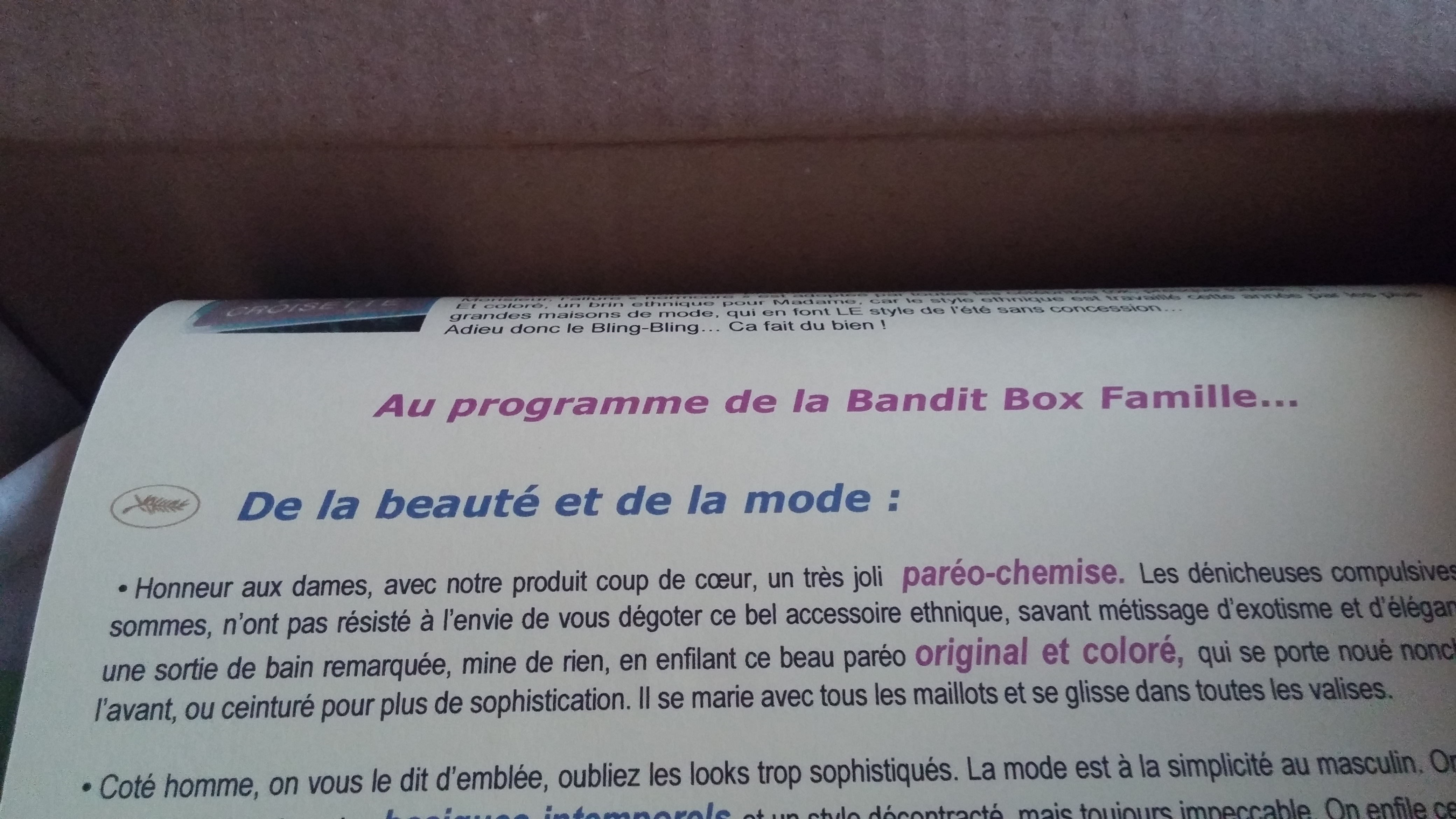 Un carton simple mais suffisant (quand il n’est pas perdu par la Poste…)Et dès l’ouverture un long papier qui explique ce que l’on va découvrir dans la box. Ceux qui aiment les surprises doivent éviter de le lire !