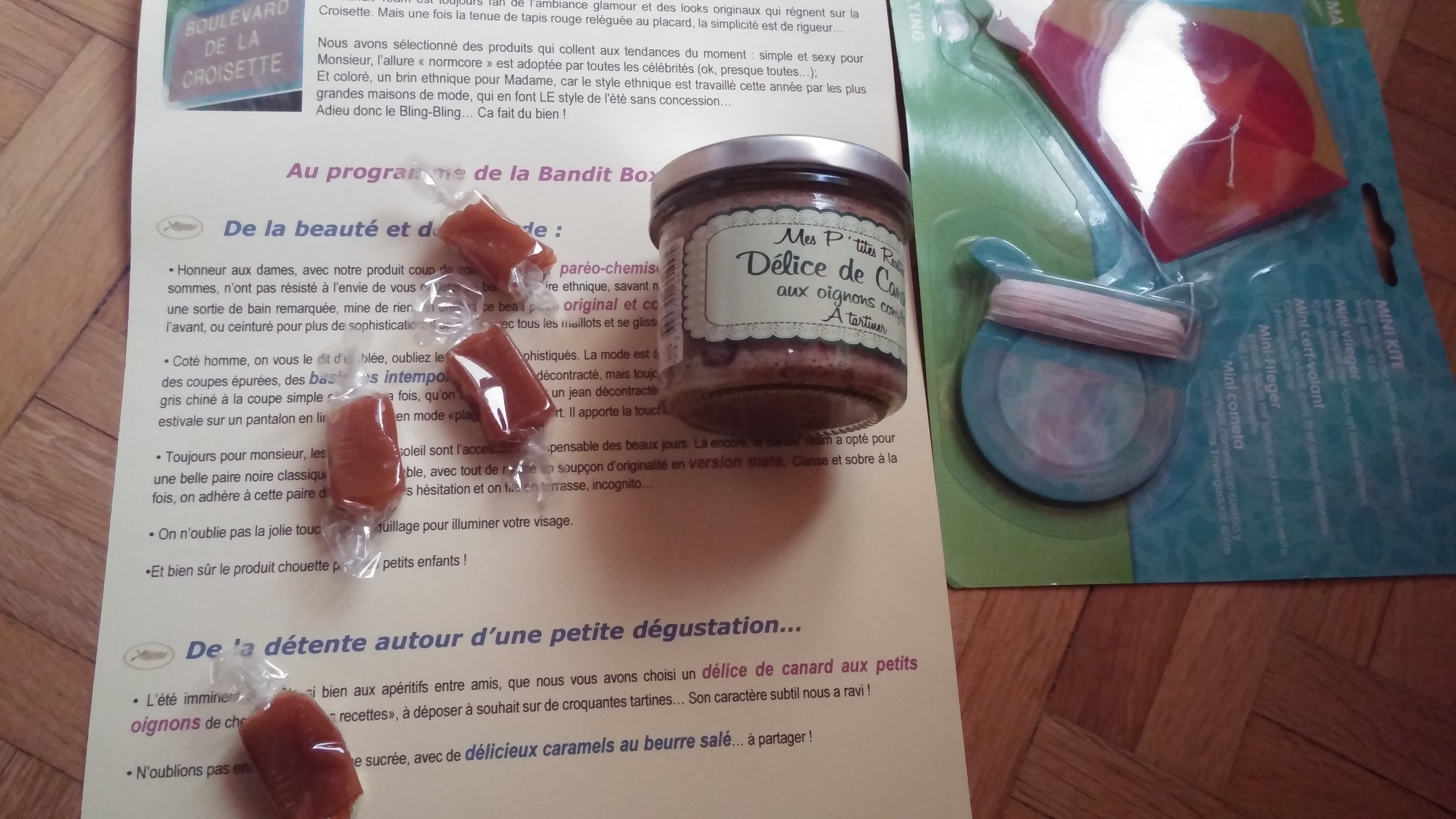 D’un côté la nourriture, de l’autre les objets.Caramels, délice de canard à tartiner, les choix « culinaires » de Bandit Box sont toujours sympaMaquillage, débardeur et paréo « coloré ». Pour tous les goûts !Par contre, la Bandit Box présente toujours une grande diversité d’objets et de choses à manger, et de ce côté là, la box est pas mal (ce qui avait plu avec les deux premières Bandit Box « Lui »)