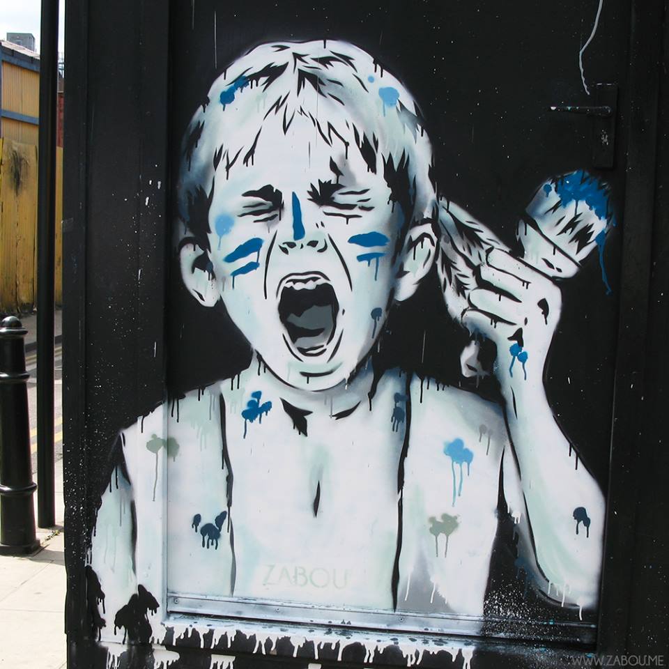 Commençons par Zabou (http://zabou.me/), une artiste française vivant en Angleterre. Elle aime représenter les enfants, mais pas les plus sages. Et cette approche « sale gosse » (mauvaises attitudes mais aussi salis par la peinture) plait aux enfants.