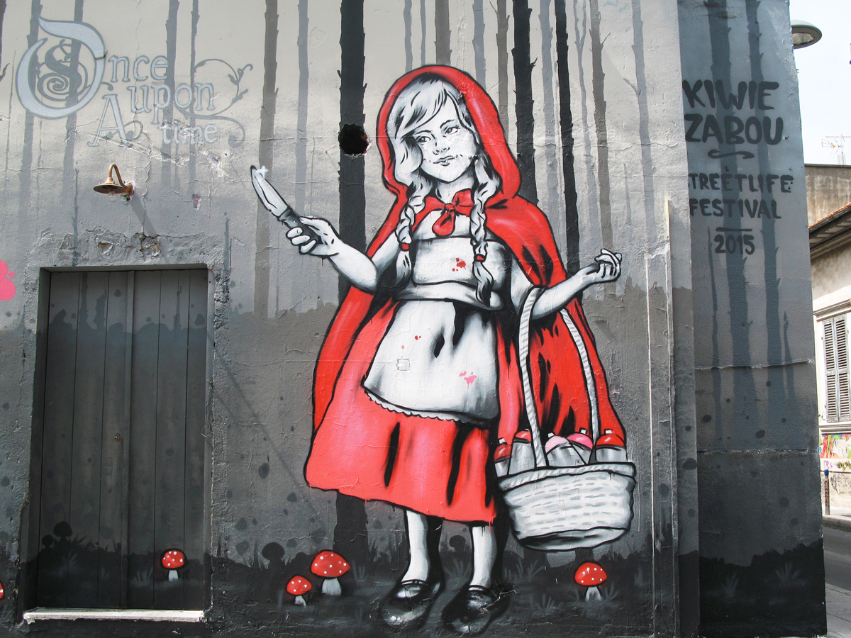 On trouve aussi du détournement d’images populaires, avec cet exemple du petit chaperon rouge, du ludique avec un caméléon joueur ou du plus interrogatif avec une ado (jeune adulte) solitaire.