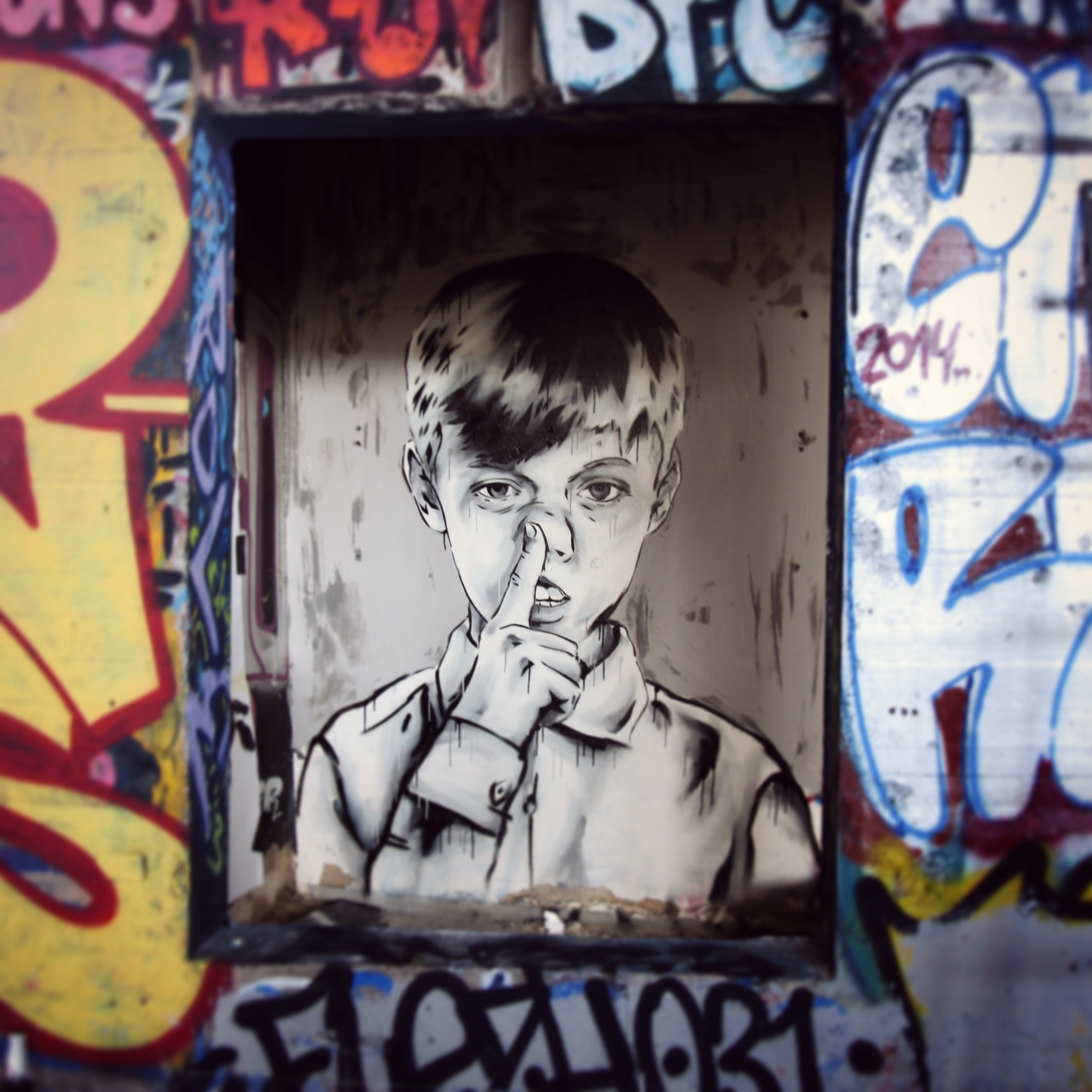 Enfant qui met le doigt dans le nez (en regardant fixement), enfants qui jouent avec la peinture (série « paint war »), accompagnés de chats, ou chats seuls. L’imagination de Zabou est grande et sa technique, reconnaissable est superbe.