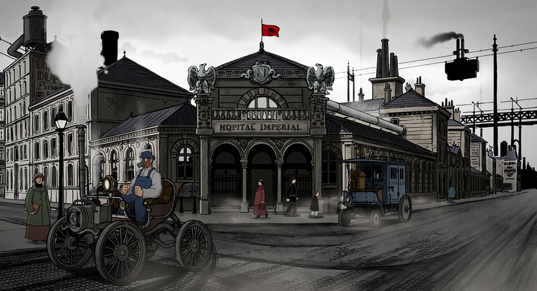 Tout cela se passe essentiellement dans un Paris sombre, pollué, et dont l’aspect est modifié par l’absence de certaines inventions.